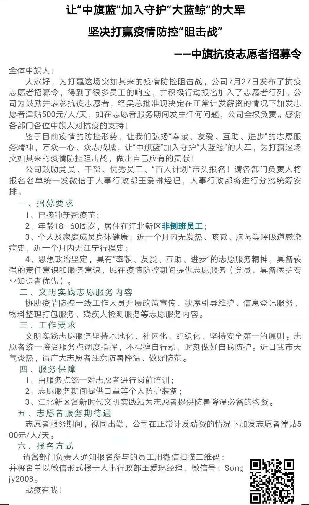 自7月20日南京祿口爆發(fā)新一輪新冠疫情以來,中旗科技立即行動(dòng)組織全員應(yīng)對這場防疫攻堅(jiān)戰(zhàn)。根據(jù)政府防疫布控要求,嚴(yán)格落實(shí)各項(xiàng)防疫防控措施。確保每位員工做好個(gè)人防護(hù)、定時(shí)定點(diǎn)核酸檢測。公司還于7月27日、29日兩度發(fā)布中旗科技“抗疫志愿者招募令”,倡議符合條件的員工,尤其是黨員、干部、優(yōu)秀員工、“百人計(jì)劃”積極報(bào)名,志愿加入江北新區(qū)疫情防控一線工作中,協(xié)助開展政策宣傳、秩序引導(dǎo)、檢測協(xié)助等社會防疫活動(dòng)。通知一經(jīng)發(fā)布,得到了中旗員工廣泛響應(yīng)和積極報(bào)名。