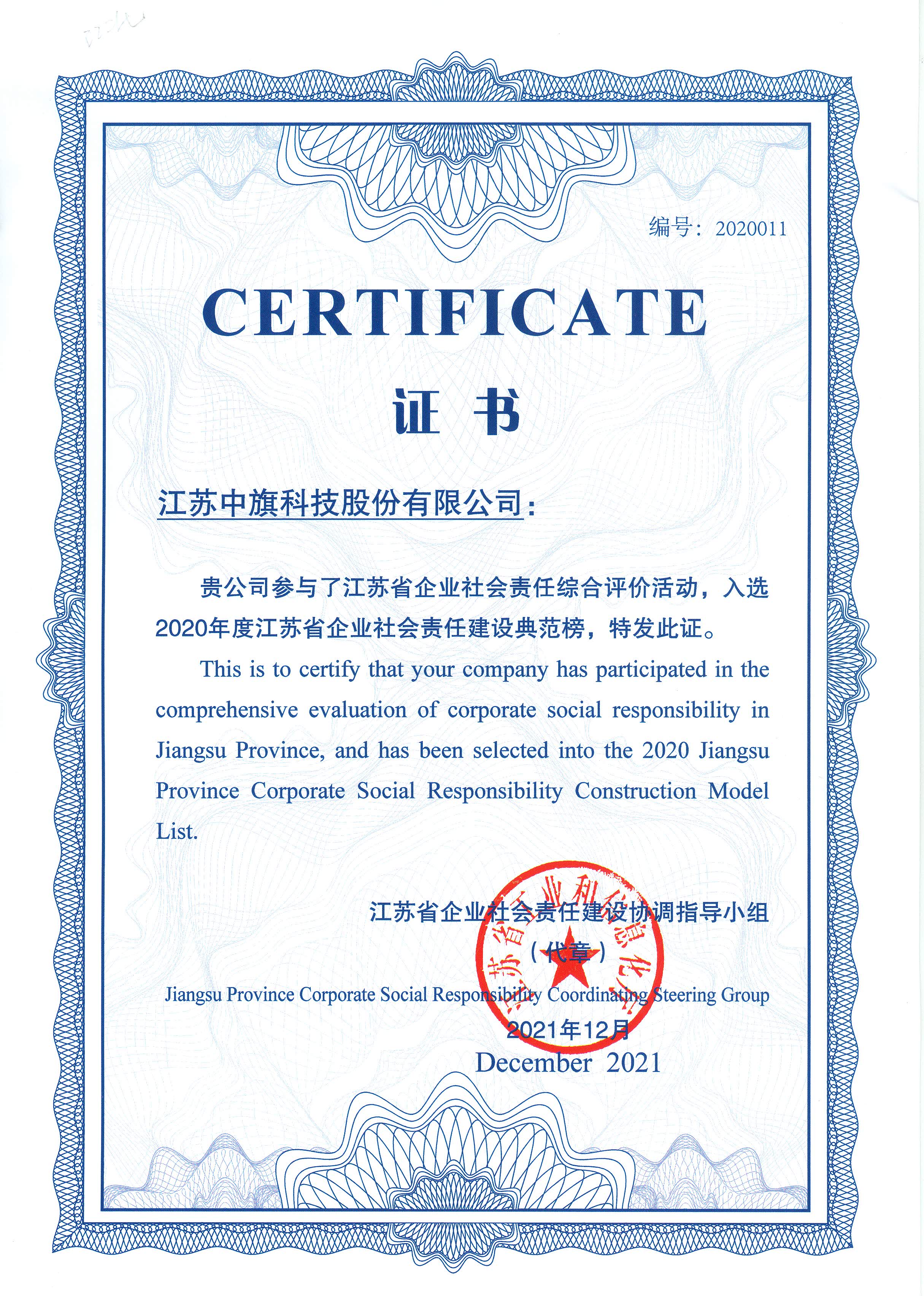 近日,江蘇省工業(yè)和信息化廳發(fā)布《江蘇省企業(yè)社會(huì)責(zé)任建設(shè)綜合評(píng)價(jià)報(bào)告(2021)》,以推動(dòng)相關(guān)行業(yè)和企業(yè)社會(huì)責(zé)任建設(shè)成效獲得更快實(shí)質(zhì)性進(jìn)展,同時(shí)對(duì)在社會(huì)責(zé)任建設(shè)與承擔(dān)方面工作突出的企業(yè)予以表彰。中旗科技榮登“2020年度江蘇省企業(yè)社會(huì)責(zé)任建設(shè)典范榜”。